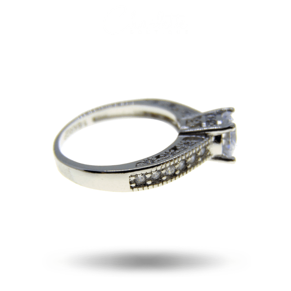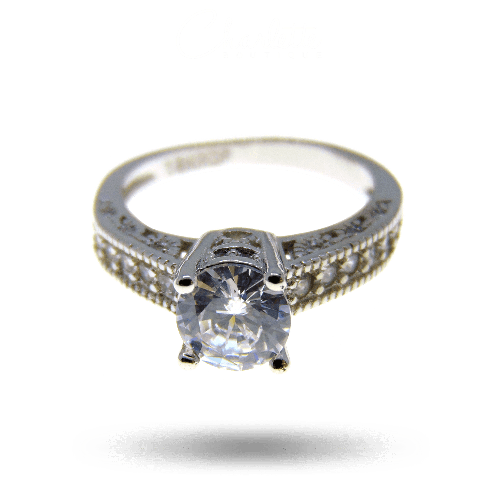 Fényes platina színű fehér köves és kövekkel díszített női gyűrű.