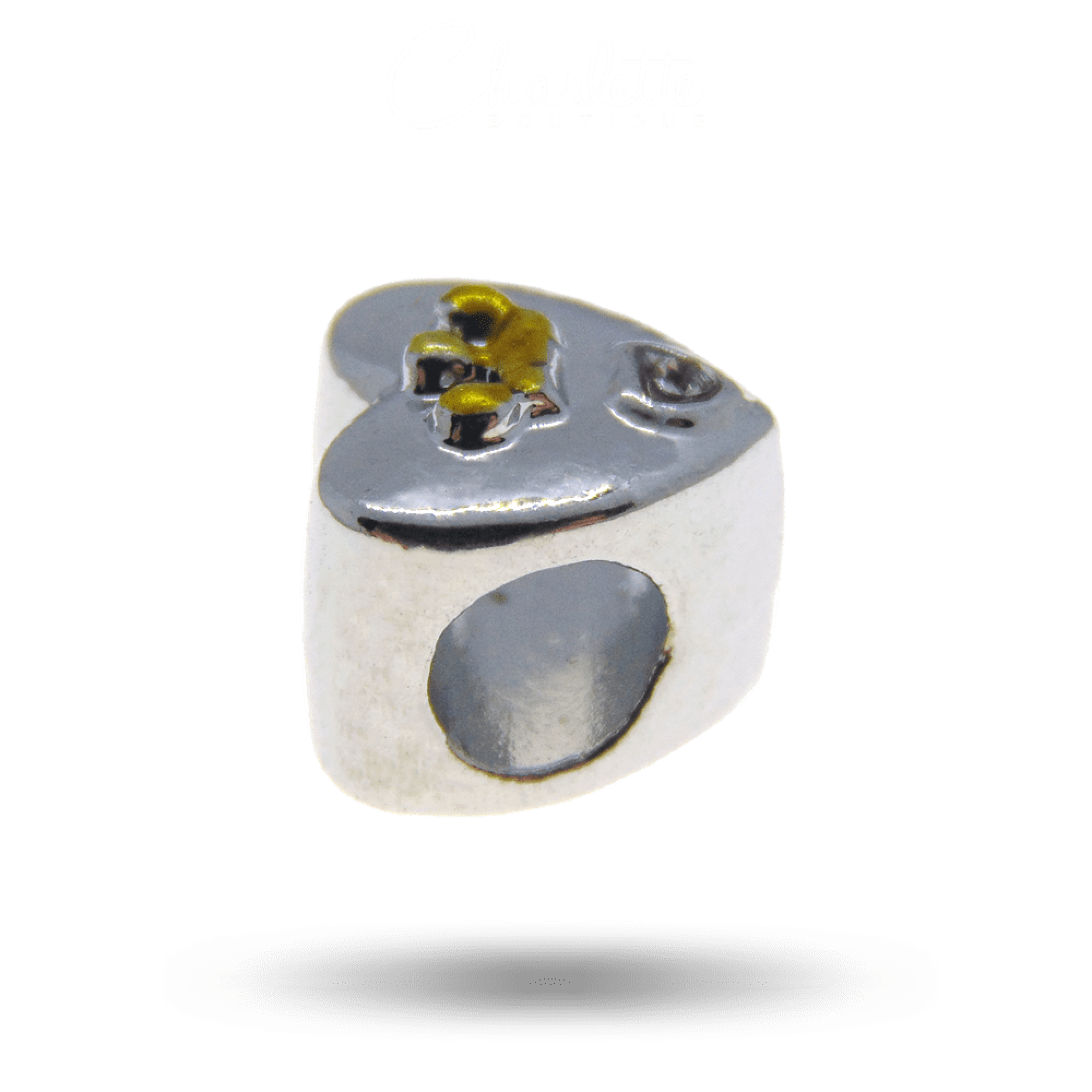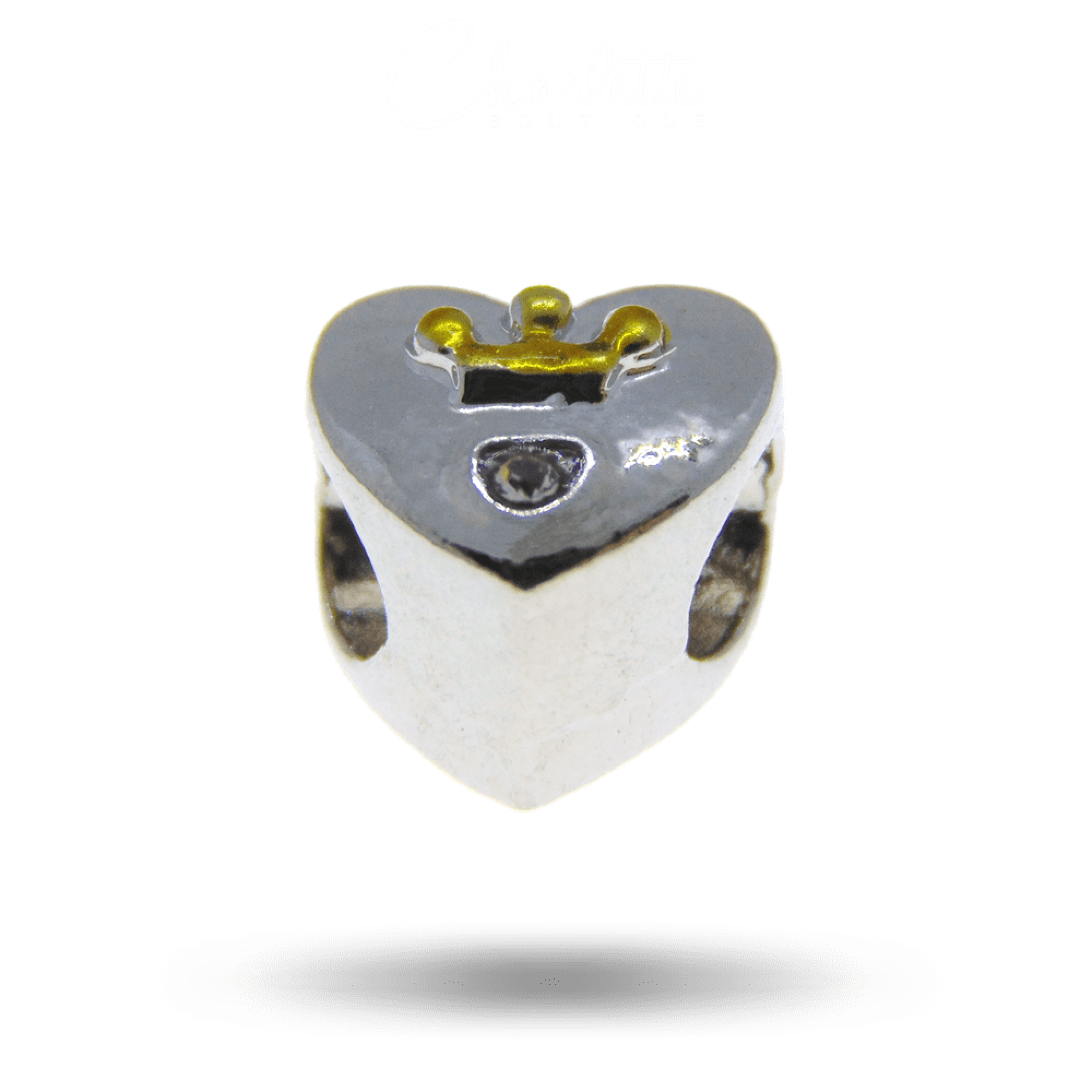 Fényes patinázott ezüst színű szív alakú arany korona mintás fehér köves charm.