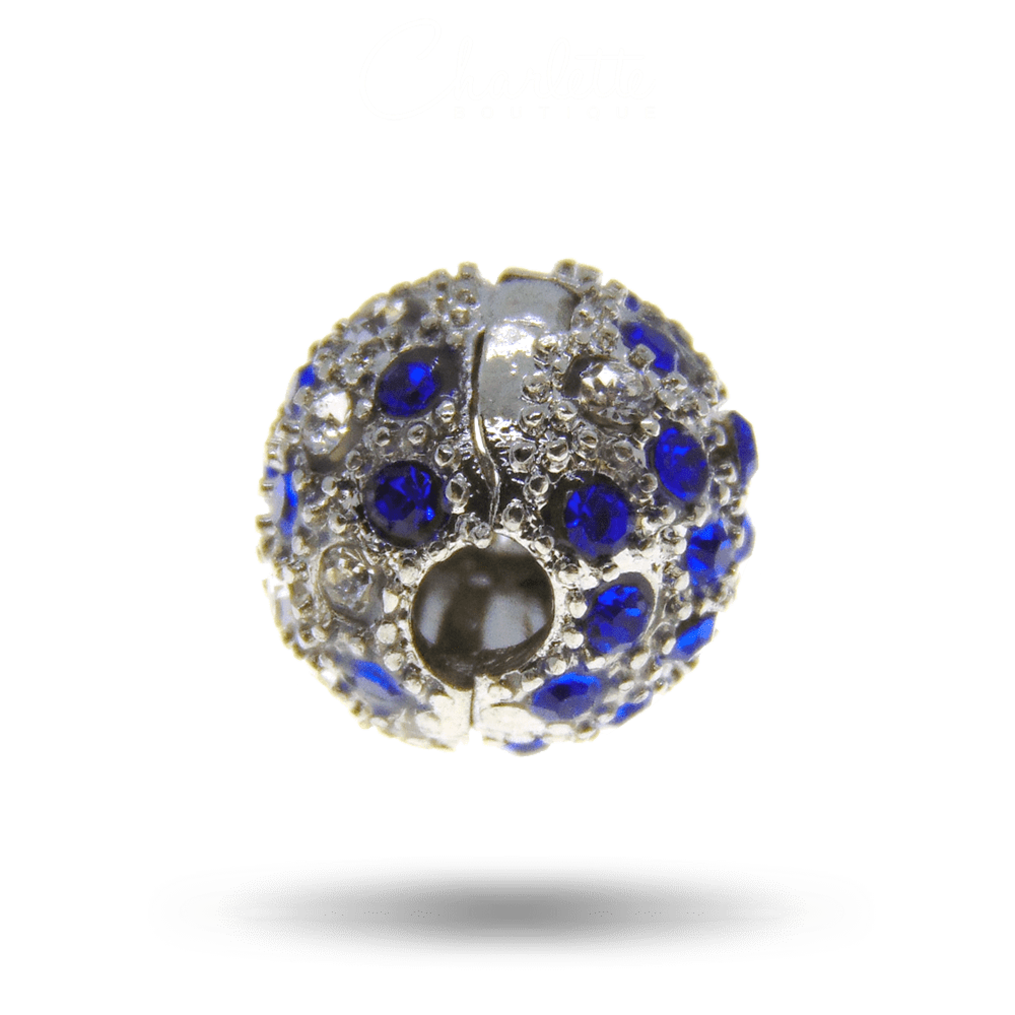 Fényes ezüst színű gömb alakú kék és fehér köves klip charm.