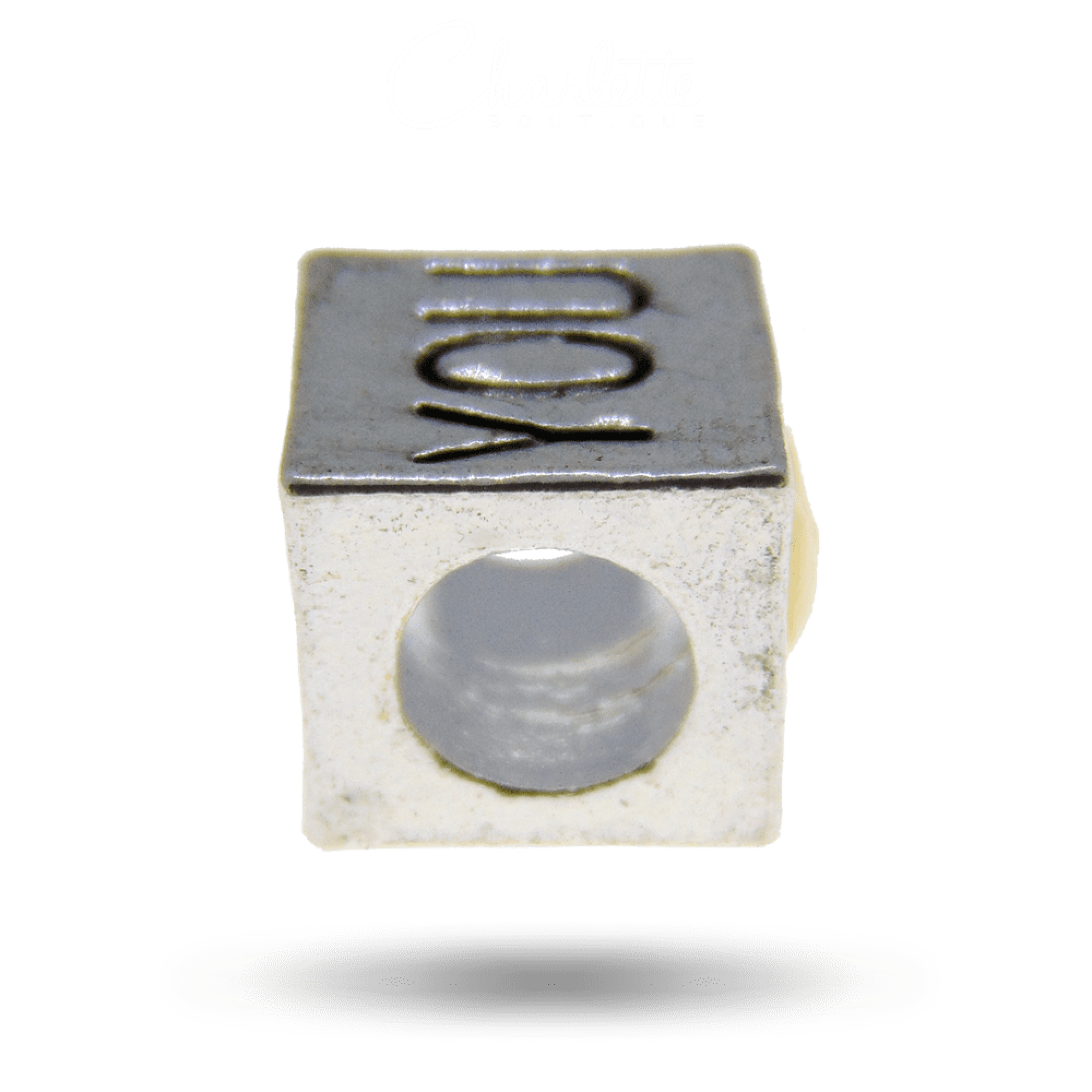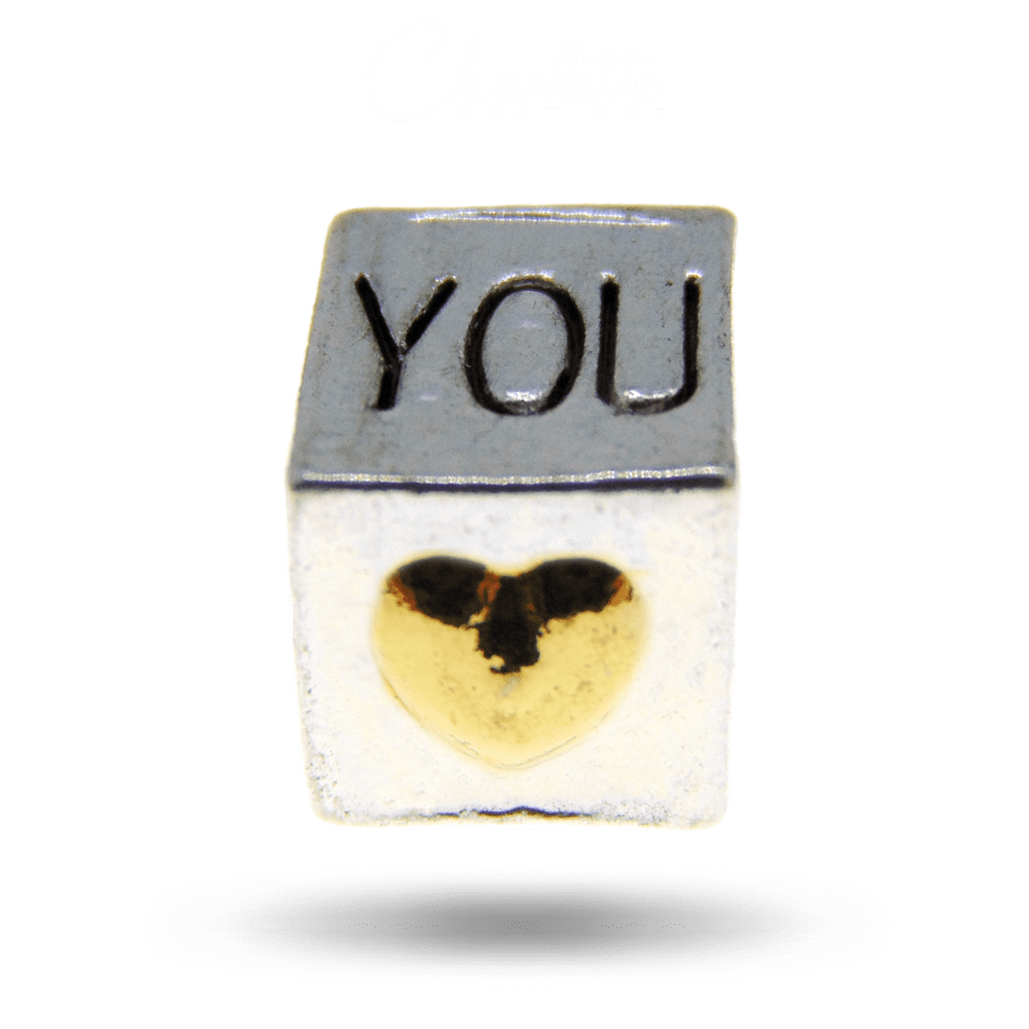 Fényes patinázott ezüst színű kocka alakú szeretlek arany szív mintás charm.