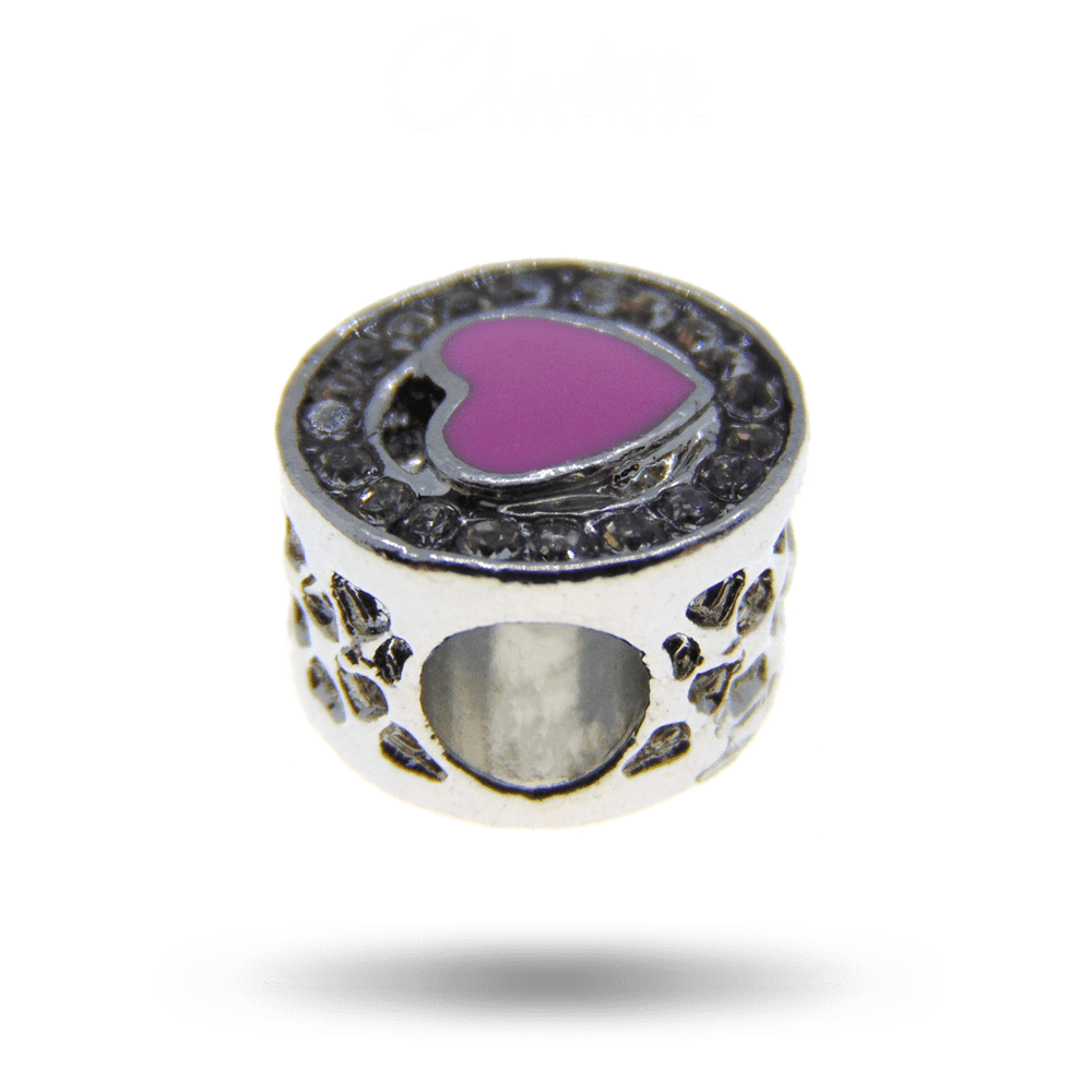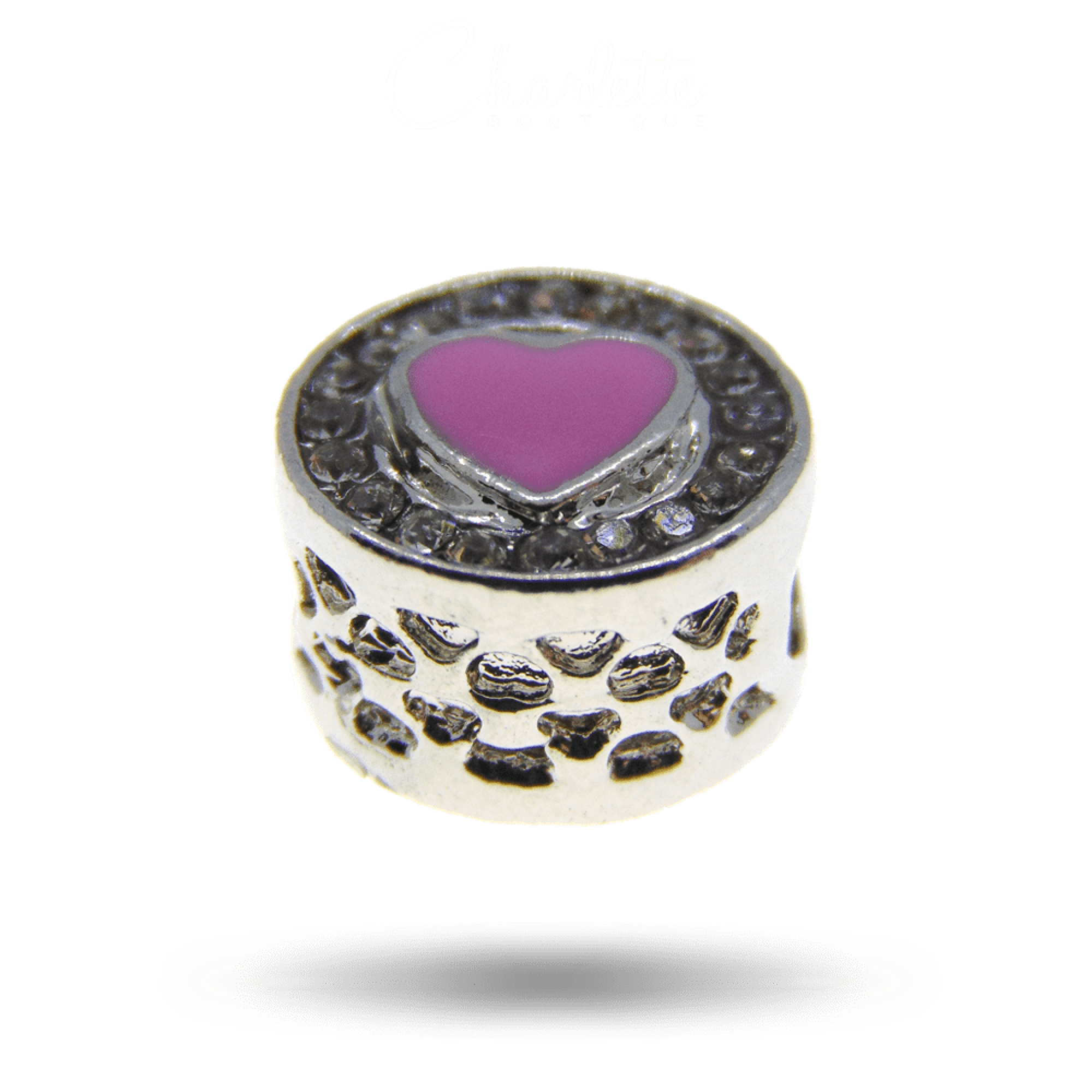 Fényes patinázott ezüst színű rózsaszín szív alakú fehér köves charm.