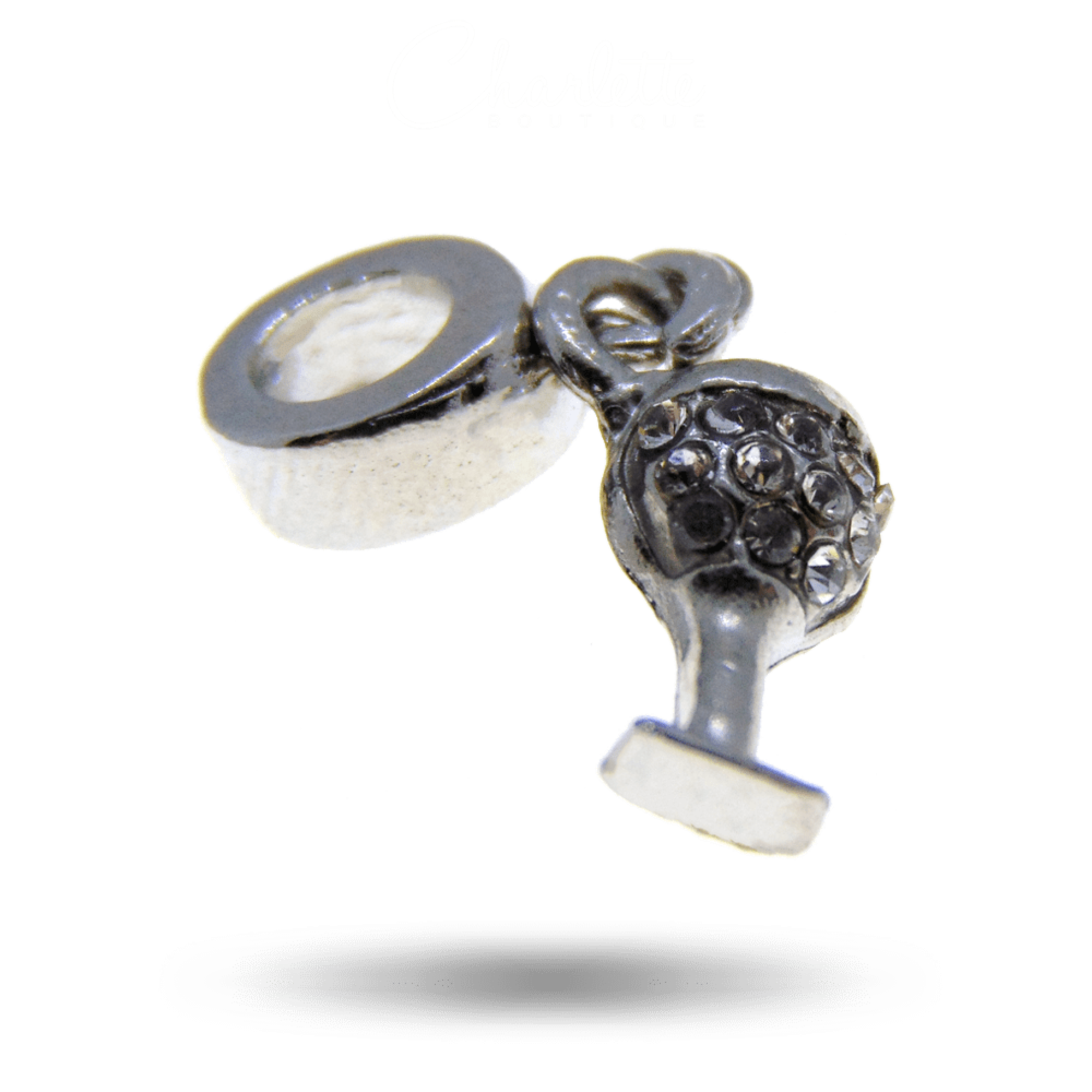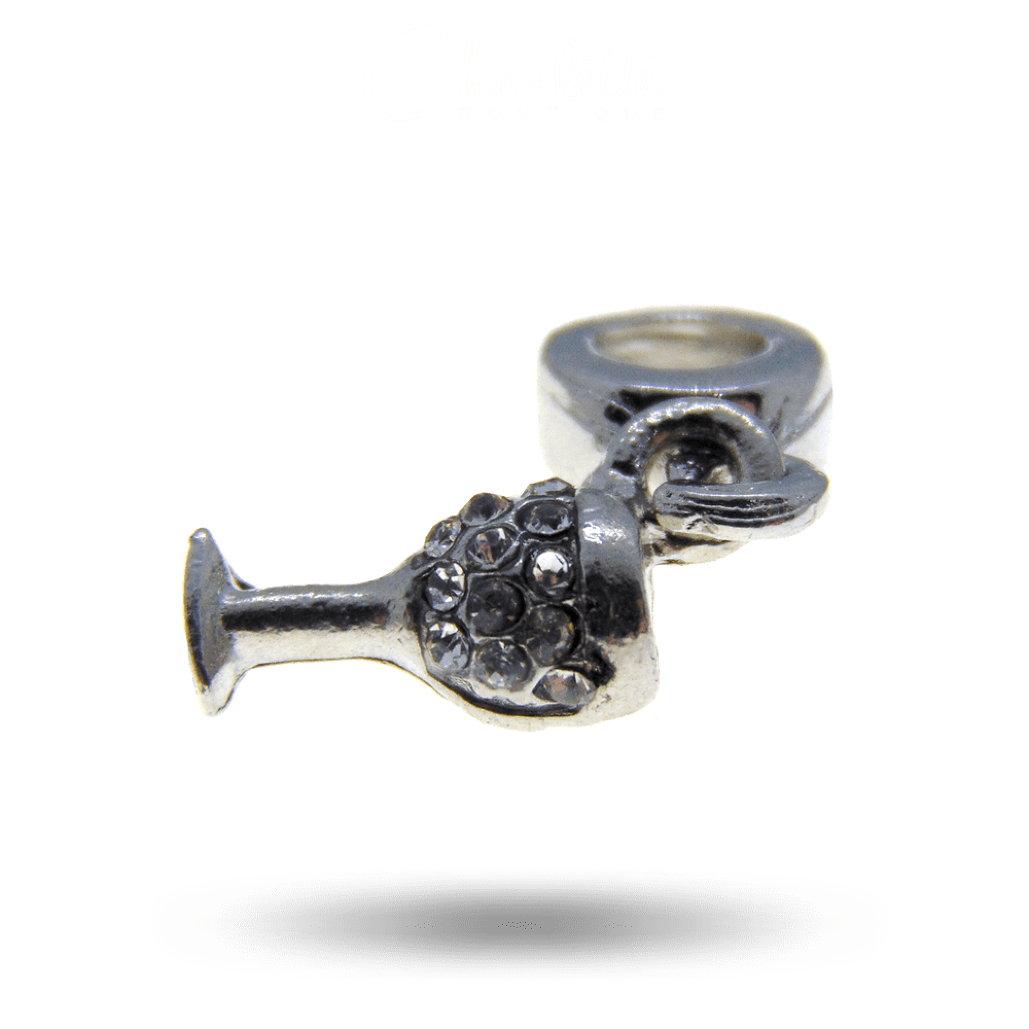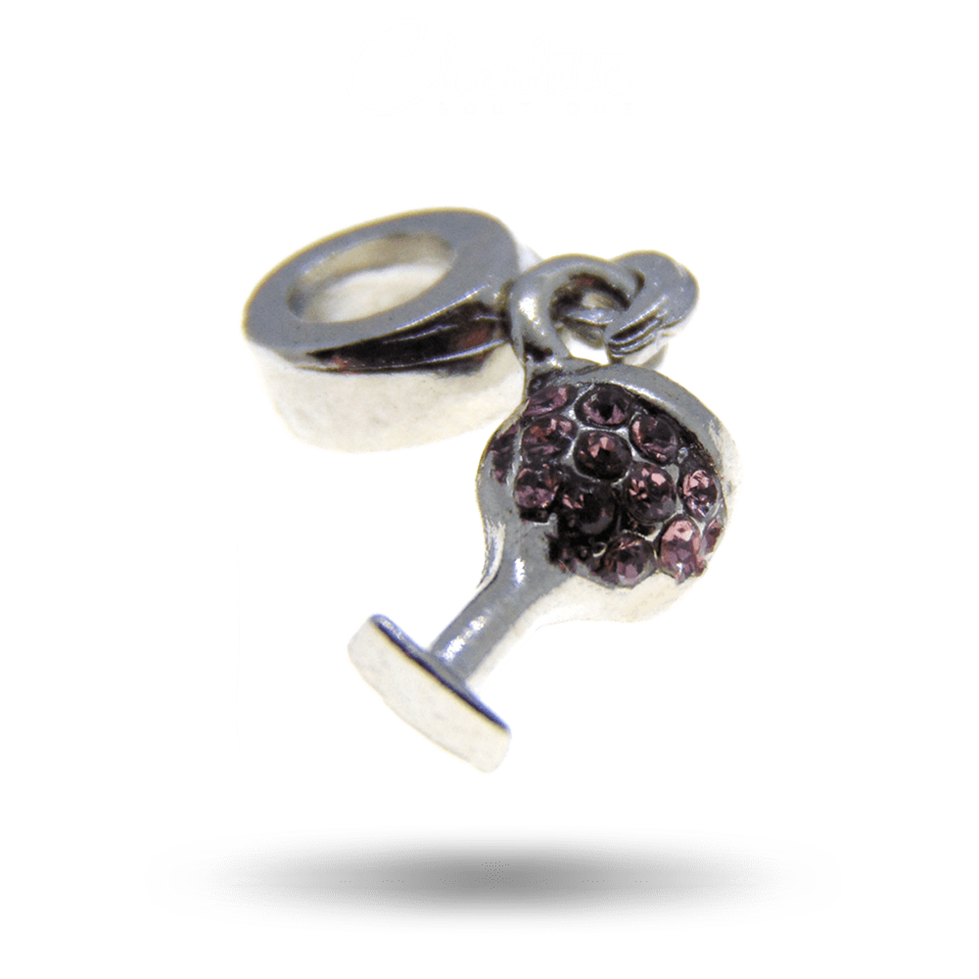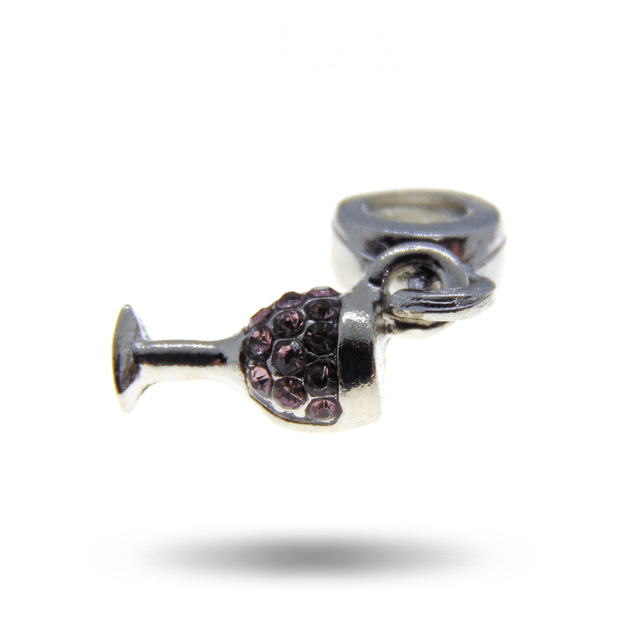 Fényes patinázott ezüst színű pezsgős pohár alakú fehér vagy bíbor köves függő charm.