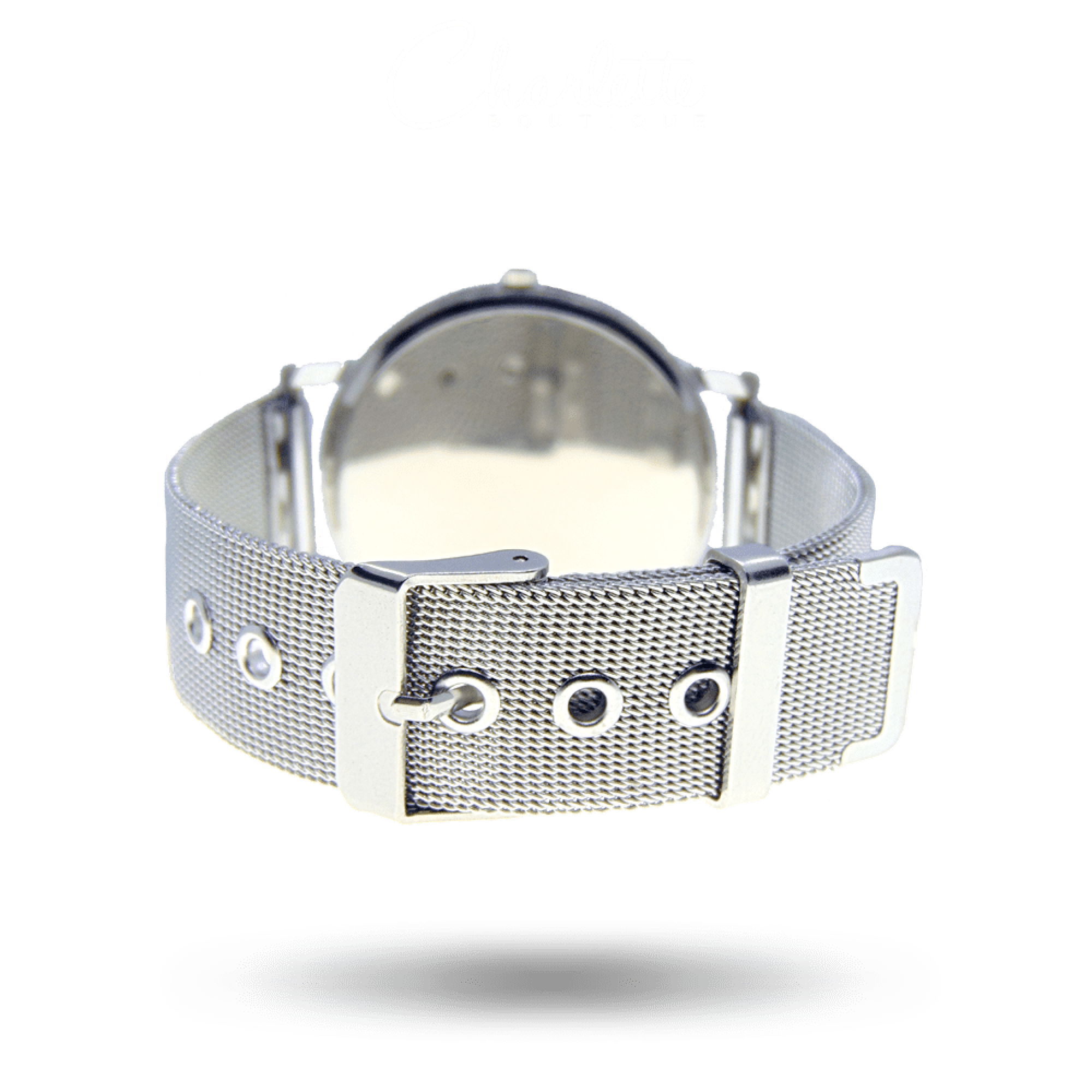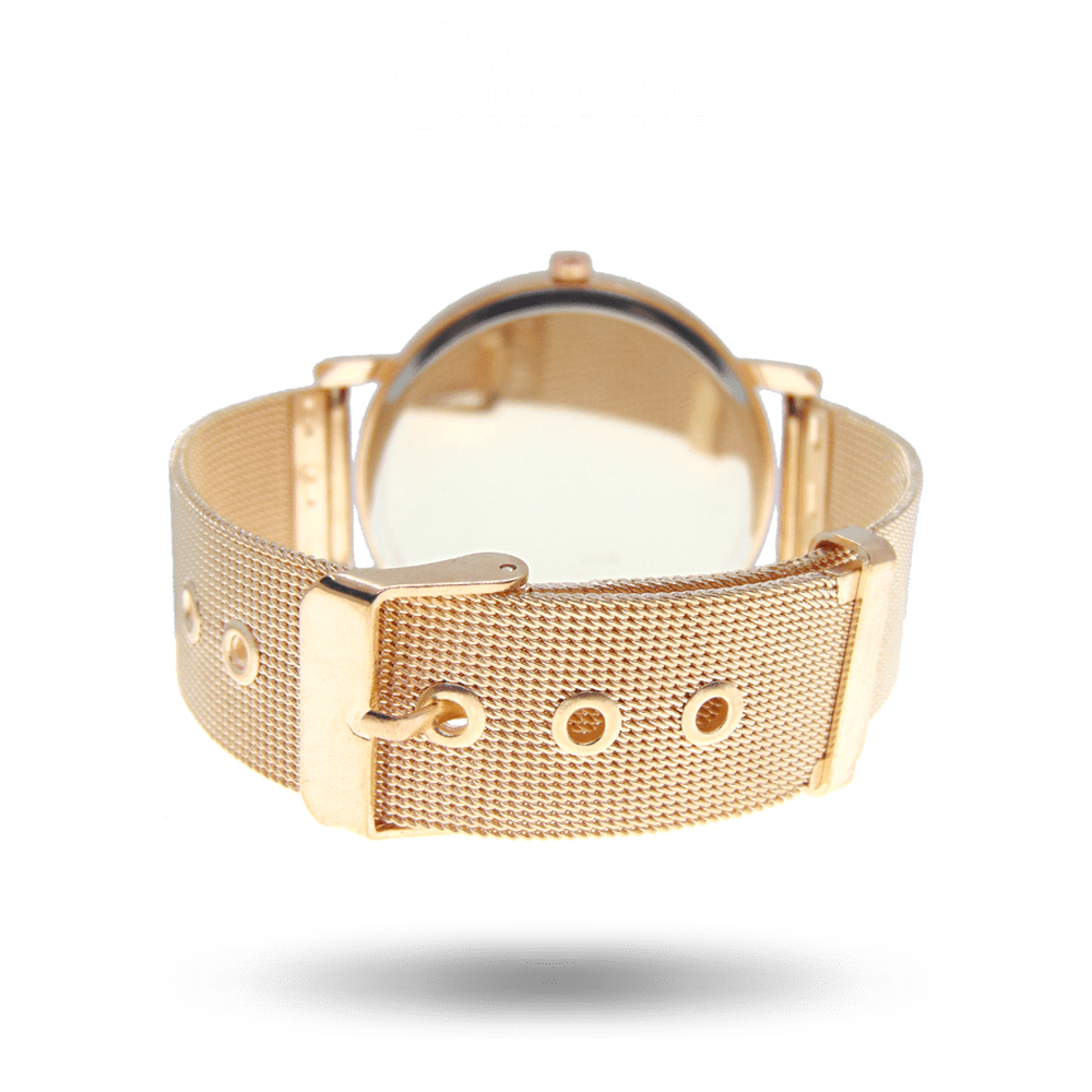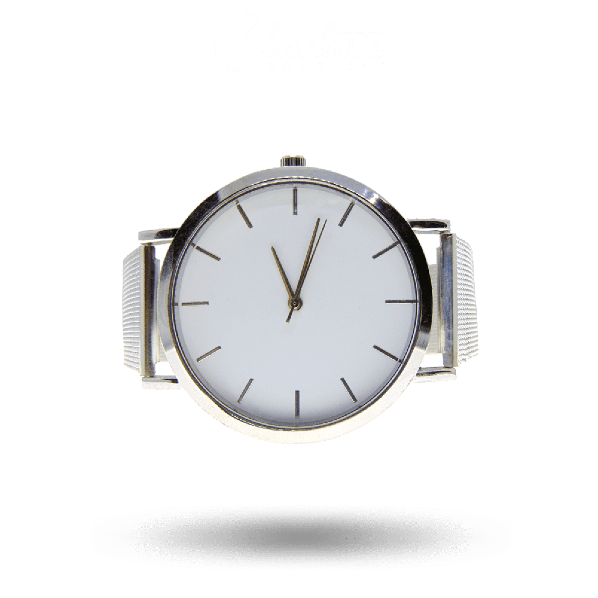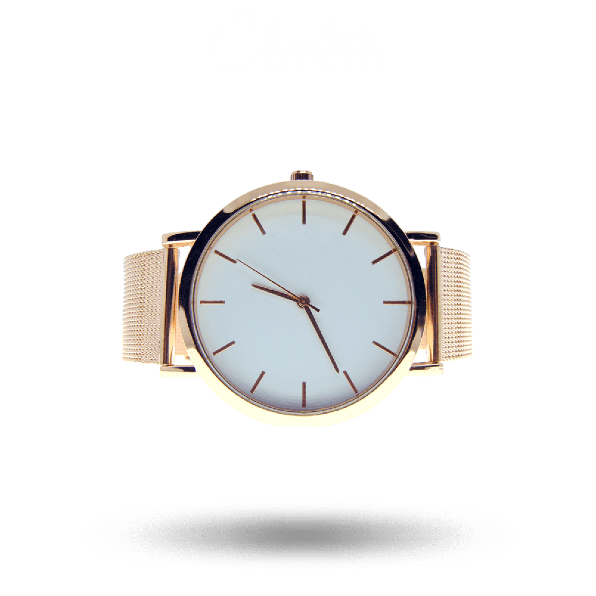 Fényes rozé arany vagy ezüst színű kör alakú fémszíjas női óra.