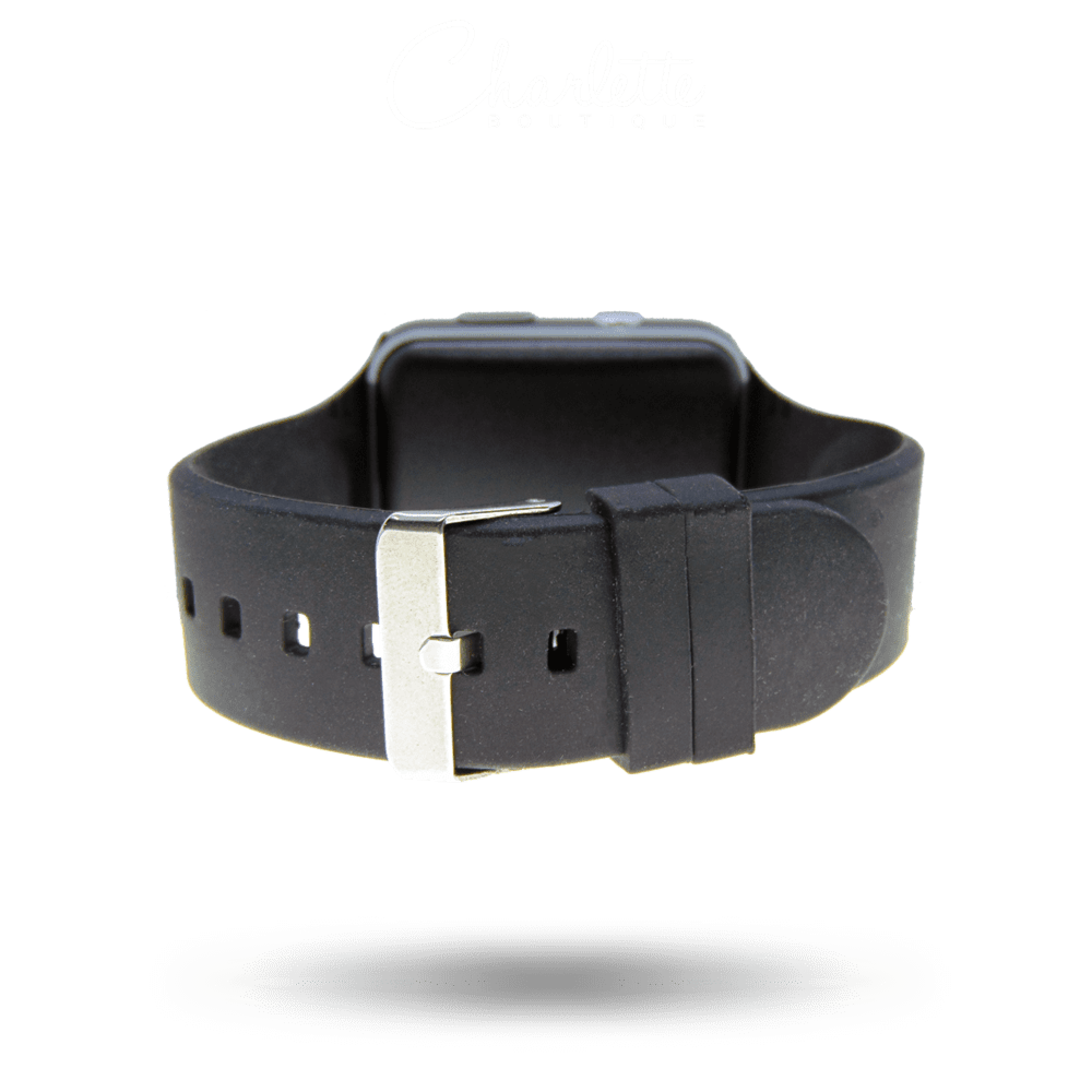 Fényes fekete színű négyszög alakú szilikon szíjas férfi okosóra.