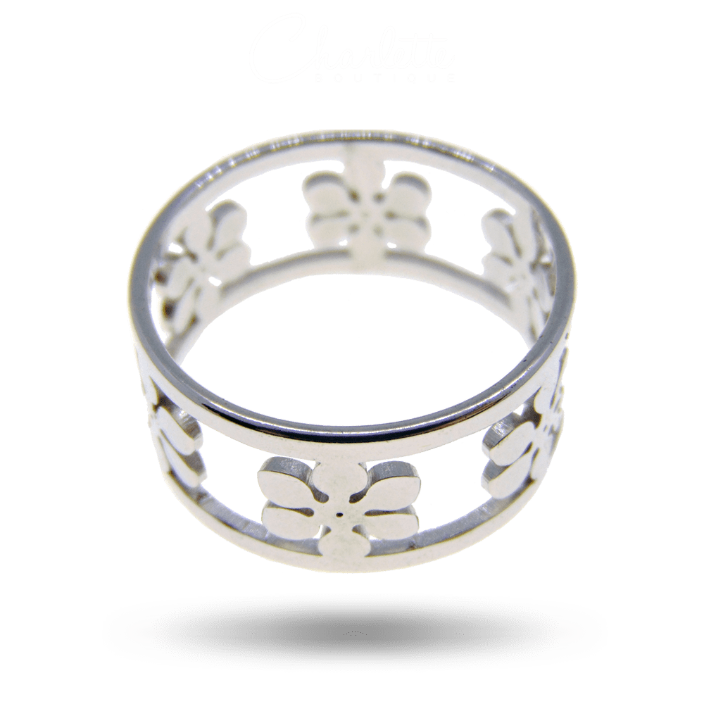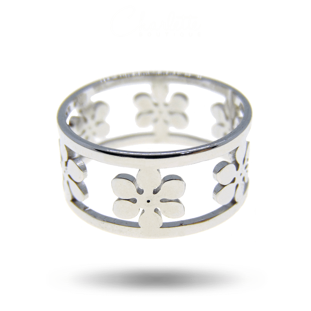 Fényes ezüst színű virág alakú női gyűrű.