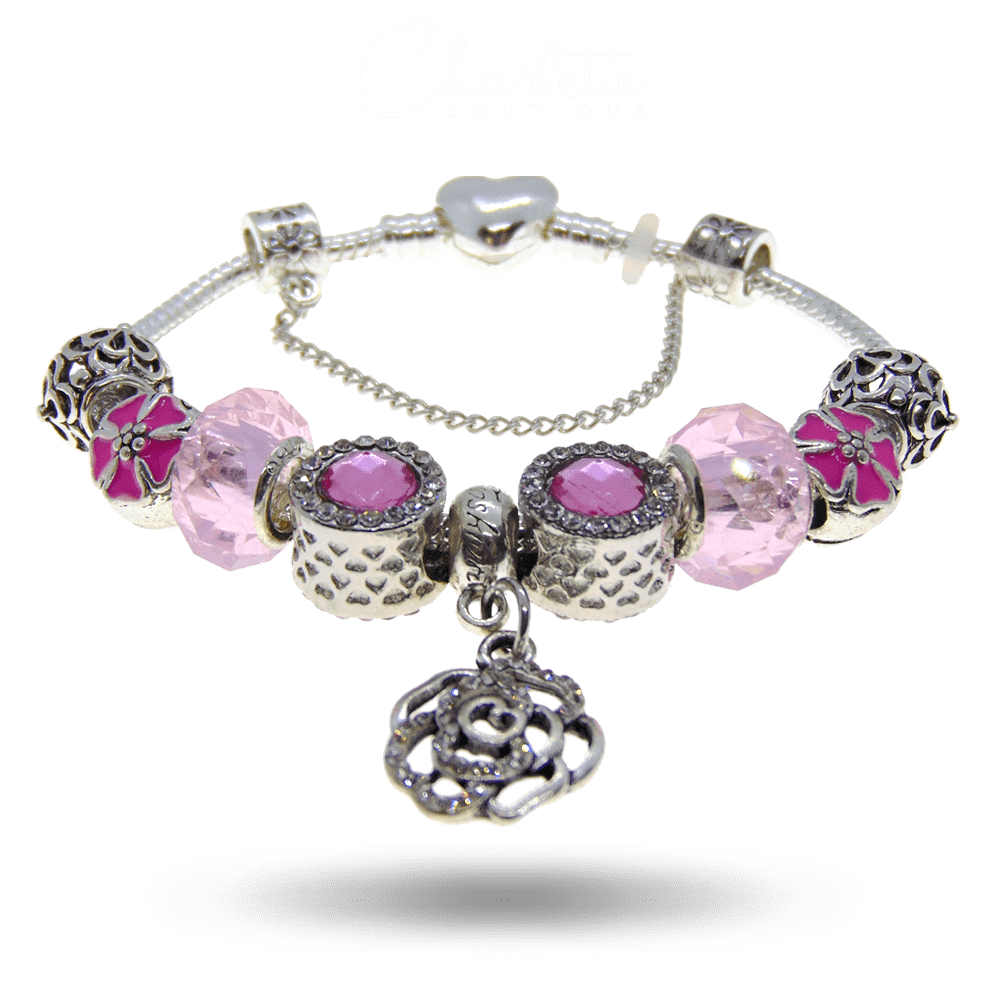 Fényes kígyó láncos női függő charm karkötő rózsával és rózsaszín meg bíbor díszekkel.