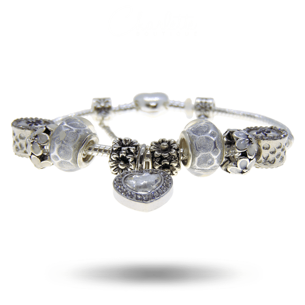 Fényes kígyó láncos női függő charm karkötő szívvel és fehér áttetsző díszekkel.