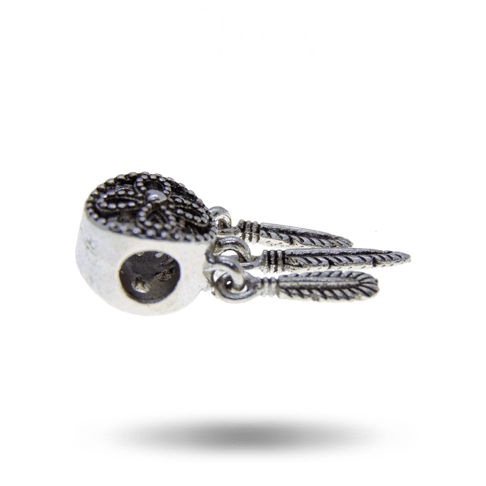 Fényes patinázott ezüst színű kör alakú álomfogó mintás charm.