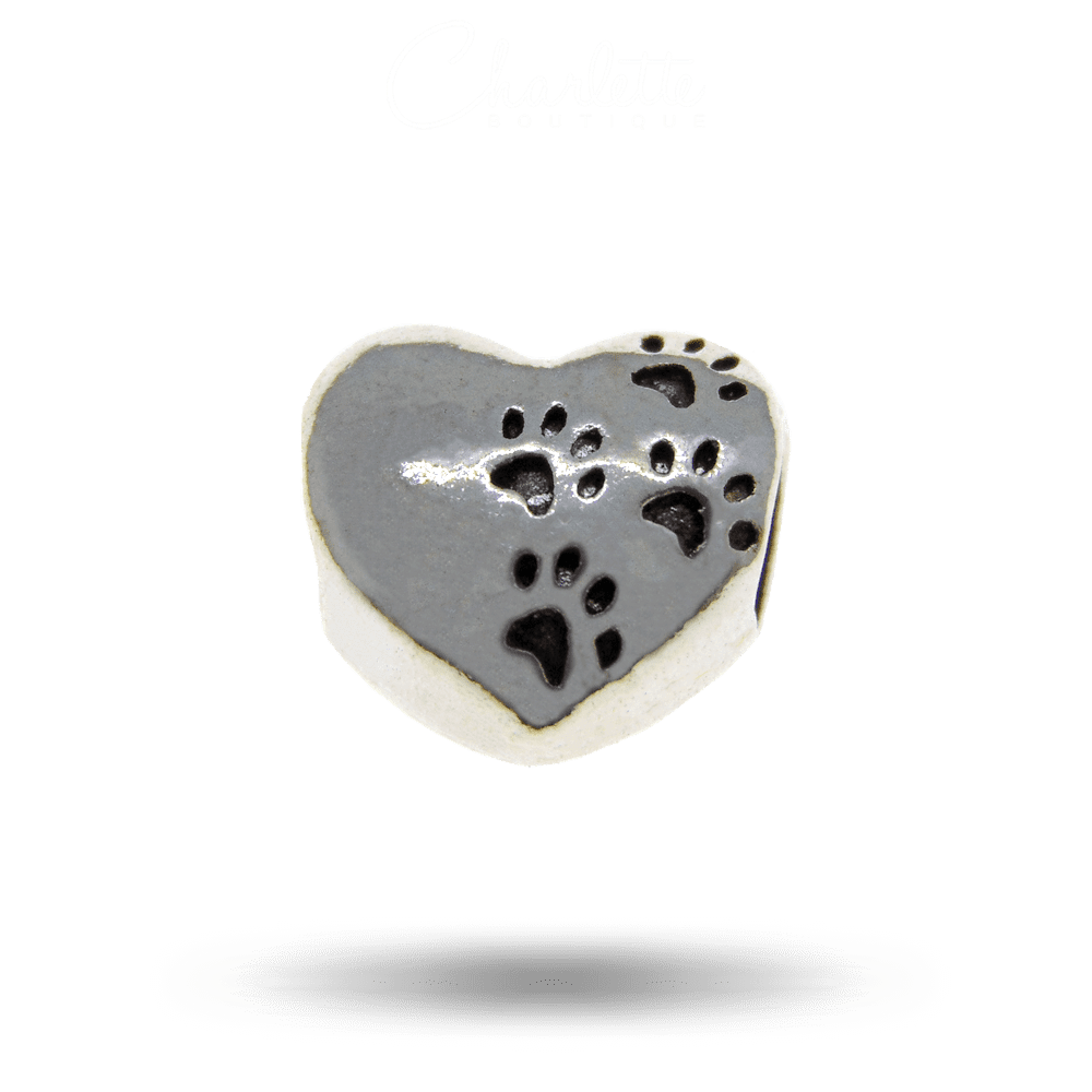 Fényes patinázott ezüst színű szív alakú tappancs mintás charm.