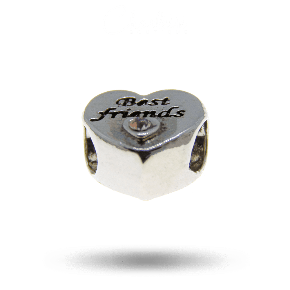 Fényes patinázott ezüst színű szív alakú legjobb barátok mintás fehér köves charm.