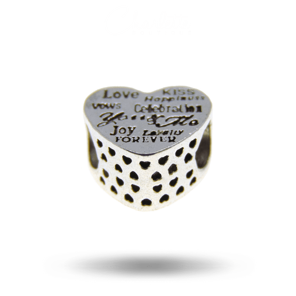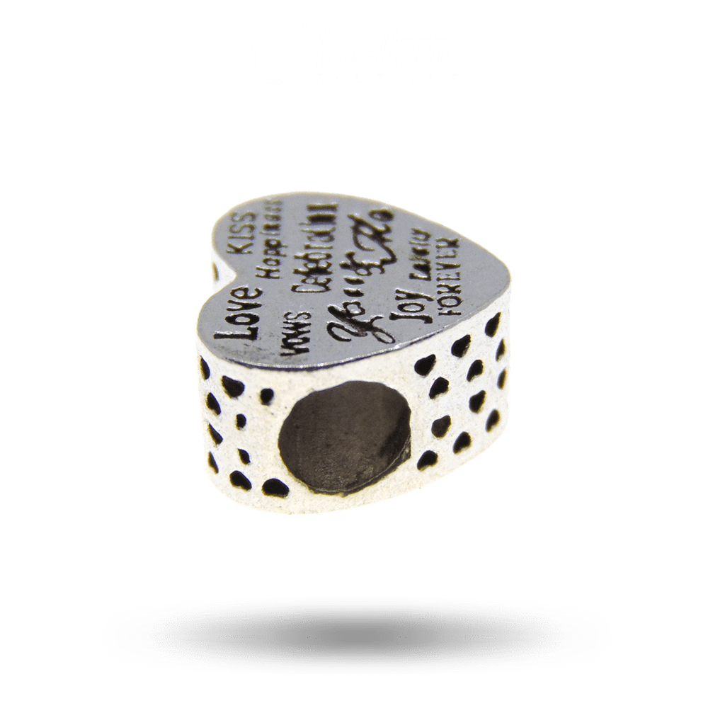 Fényes patinázott ezüst színű szív alakú érzelem mintás charm.