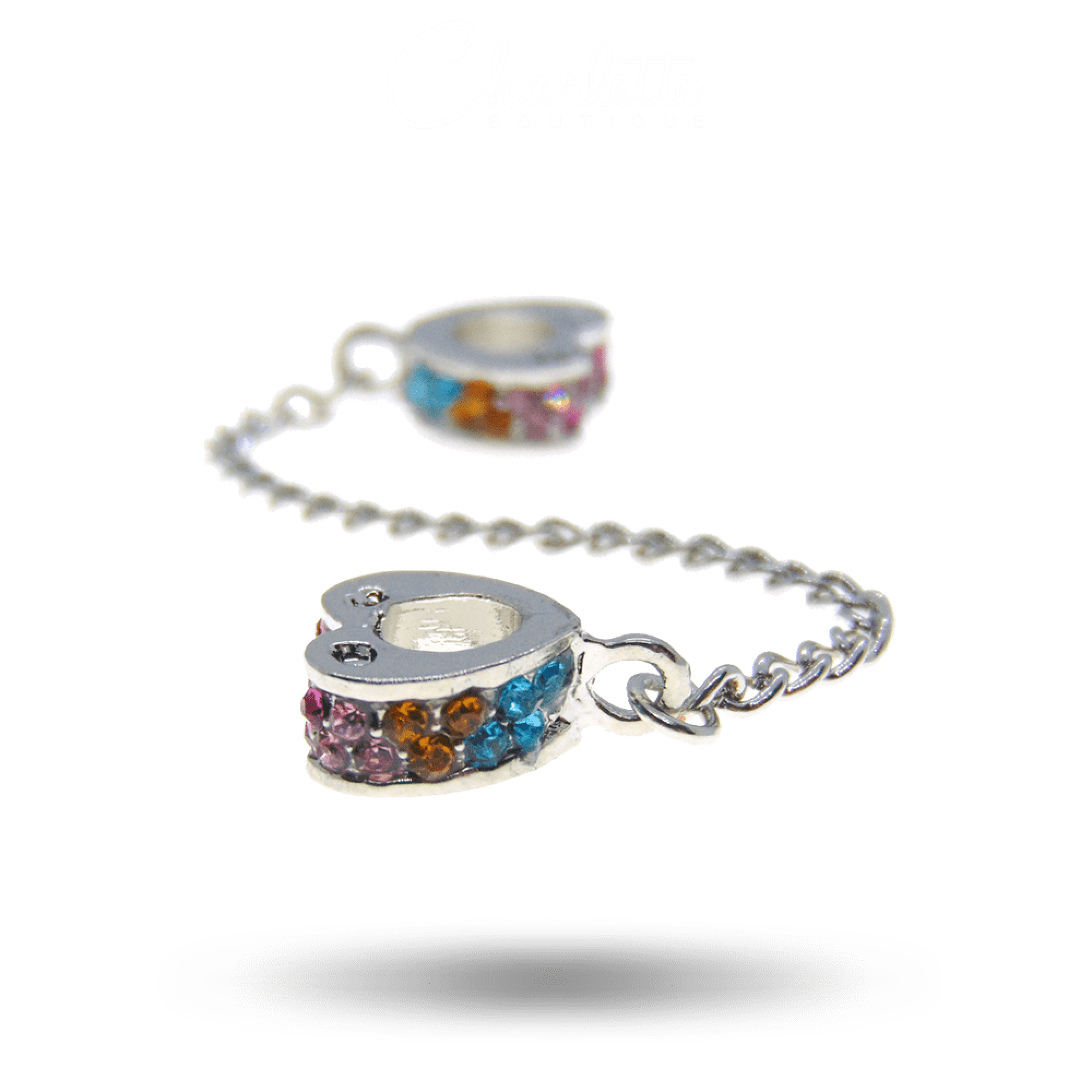 Fényes ezüst színű szív alakú dupla bíbor rózsaszín narancs kék köves charm biztonsági lánc.